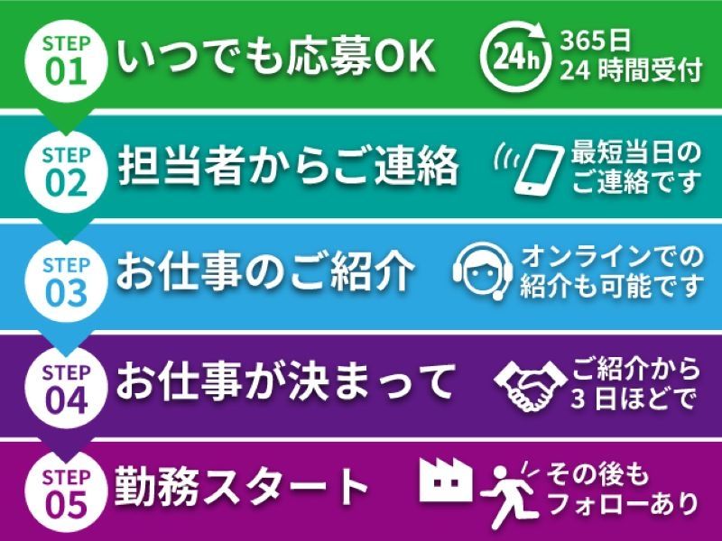 選考について 【お仕事までのステップ!】 \履歴書・職務経歴書不要!最短即日でお仕事が決定!/ ▼ STEP 1:ご応募(24時間/365日受付中) 【インターネットから】 ページ下記「応募する」よりご応募ください。 【お電話から】 0120-181-450(通話料無料) 「お仕事ナンバー[11392]希望」とお伝えください。 ↓ ▼ STEP 2:担当者からご連絡(最短当日) メールまたはお電話でご連絡いたします。 ↓ ▼ STEP 3:お仕事のご紹介 お仕事探しのプロがご案内(オンライン対応可) 職場の雰囲気や具体的な仕事内容・職場環境などお伝えします。 開始時期や赴任方法などもご相談可能です。 ↓ ▼ STEP 4:お仕事決定(ご紹介当日~3日) 最短でお仕事をご紹介した当日に内定! 勤務開始当日までの流れをメールまたは電話でご説明します。 ※勤務開始前に工場見学を実施します。 ↓ ▼ STEP 5:勤務開始 勤務開始当日までは現場担当者がしっかりサポート! 安心してお仕事を始められます。 ※上記は目安となります。 応募について 【応募方法】 まずはお気軽にお電話かWEB応募にてご応募ください。 ※WEB応募からのご応募は24時間受付可能です。 応募確認が出来次第、折り返しご連絡させていただきます。 【応募先企業名】 株式会社日本ケイテム 【応募先担当者】 採用係 【応募先住所】 京都府京都市下京区七条通堀川西入西八百屋町160 【電話対応可能時間】※24時間・365日受付中!お気軽にどうぞ。