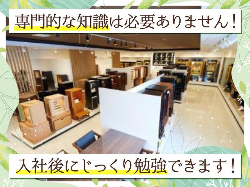 仕事内容 ●求人のおすすめポイント● ✅土日祝は時給100円UP!! ✅業界経験や専門的な知識は不要! ✅1日5時間~、週3・4日程度でOK!扶養内勤務OK! ✅未経験OK!人柄重視の採用です◎ ✅人と話すことが好きな方にピッタリのお仕事です。 ✅長期勤務で安定!転勤なしです♪ 【仕事内容】 ✅店舗での接客・お客様対応 ✅電話対応や資料請求へのフォロー 【専門的な知識はなくても大歓迎です!】 温かい雰囲気の中で、心のこもった接客を大切にしています。 【未経験歓迎!】 先輩スタッフも未経験から始めた方ばかりなので、 「何がわからないか」「困りそうなこと」は 先回りをしてサポートができる体制です。 最初は半年ほど、業務のサポートからお願いいたします! 【専門的な知識は無くてもOK!】 仏壇・仏具・墓石に詳しい方は少ないと思いますから、 入社後に仕事を覚えていって1人立ちしていただければ大丈夫です。 【温かくて働きやすいお店です◎】 仏壇・仏具と聞くと「難しそう…」「カタそう…」 と思われがちなこの業界ですが、実際は明るいスタッフが多く、 店内もとても温かい雰囲気です。 【スタッフの声】 お客様とのお話の中身は悲しいものばかりではなく、 楽しかった想い出などをお聞きしつつ、 お客様にピッタリなお仏壇選びのお手伝いをしていきます。 店内では笑い声が聞こえることも多く穏やかな雰囲気ですね。 商品はもちろん、供養や葬儀についてなど、 働きながら身に付けた知識を長く活かせる仕事です。 最初から即戦力としての活躍を期待しているわけではなく、 長く働くことで成長していってくださればと思います。 安心して働ける環境ですよ◎