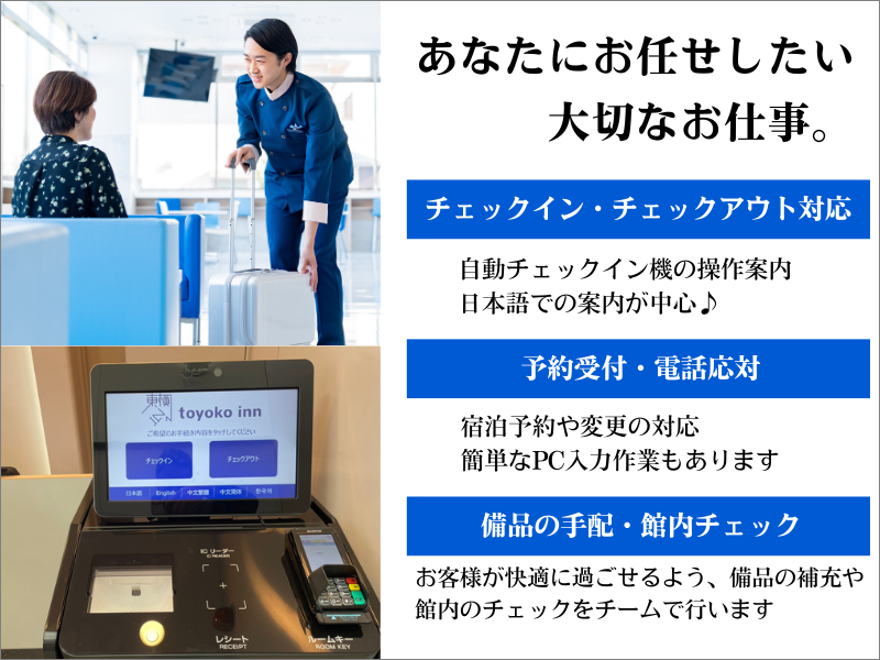 仕事内容 \\\こんな毎日が、現実になる/// ⏩退勤後にそのまま弾丸海外旅行 ⏩平日の混雑していないアウトレットでショッピング ⏩好きなアーティストのライブは全日程制覇! オフの日は、誰にも邪魔されず、とことん“好き”に没頭 そんなライフスタイルを叶えながら、 ちゃんと正社員として働ける環境がここにあります。 ――――――――――――――――――――――――― ✅お任せするのは… ■宿泊予約の受付・変更(電話・Web) ■チェックイン/チェックアウト対応 ※自動チェックイン機の操作案内が中心 ■備品・アメニティの準備・発注 ■ロビー・館内の巡回、簡単な清掃 ■売上入力・日報作成(PC作業) 【POINT】 ✅ 翻訳機があるので語学力不問 ✅ 経験不問/ブランクOK ✅ 座学+OJT研修あり/現場は複数名体制で安心 ――――――――――――――――――――――――― ▼1週間とあるスケジュール(例) 月曜10:30〜火曜11:30:勤務 火曜午後〜木曜:完全フリー 金曜10:30〜土曜11:30:勤務 土曜午後〜月曜:完全フリー →「え?こんなに休みがあるの?」と思った方。 はい、本当です。 年間休日は169日以上。 1年の半分以上は“あなたの時間”になります。 ――――――――――――――――――――――――― ▼充実研修で、未経験でも安心スタート 基礎から学べる研修&先輩のサポートで、 初めてのホテル勤務でも大丈夫◎ 入社後は研修を受けて頂きます。 敬語やあいさつ、電話対応、お辞儀の角度まで、 ホテル接客の基本を一から学べるので安心です。 研修後も店舗にてOJTで先輩がしっかりフォロー。 複数名体制なので、 わからないこともすぐに聞けて、焦らず成長できます。
