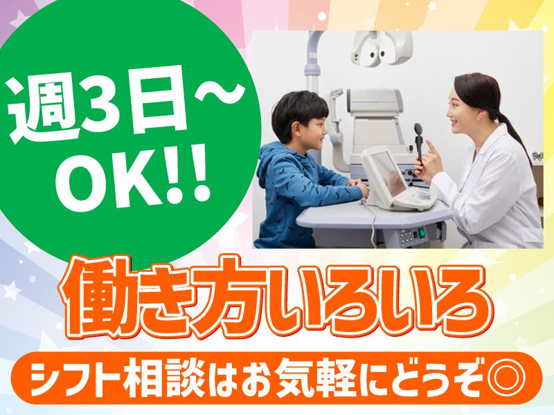 アピールポイント: ✅人気の「受付・検査補助」 ✅眼科の勤務経験は不問! ✅週3日~、日数は応相談 ✅土日できる方歓迎!! ✅土日のみの勤務もOK! ✅学生・フリーター・主婦(夫)、経験問わず大歓迎♪ ✅初バイトもOK! ✅ショッピングモール内の眼科 ✅仕事前後のお買い物などにも便利です!