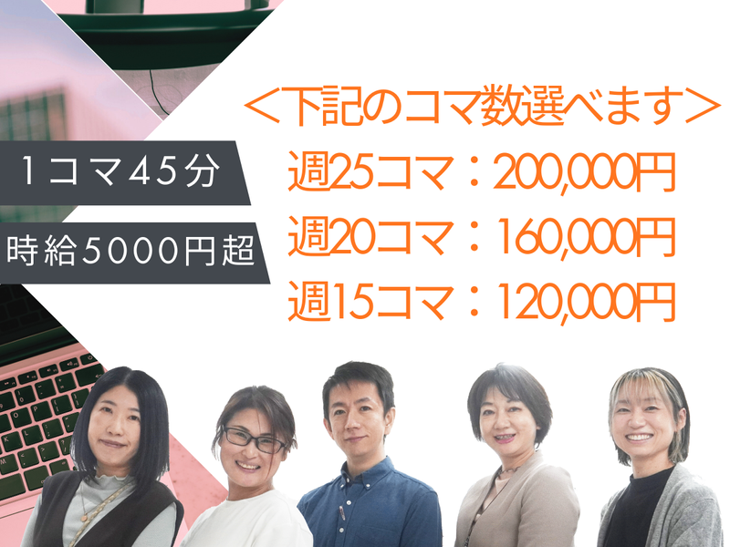 勤務時間詳細 ⏰9:00~18:00 コマ数によって時間が異なります(1コマ/45分) ※1日最大5コマが目安です ※希望の曜日や時間をお申し付けください