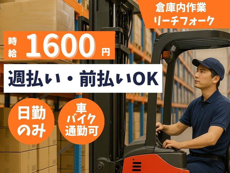 仕事内容 【この求人のPoint!】 ✨人気の日勤!高収入! ✨時給1600円 ✨月収28万円以上可 ✨土日休み ✨キレイな倉庫でのお仕事! ✨資格があれば実務経験浅めでもOK! リーチフォークリフトを 使った倉庫内作業 ドラッグストア向け商品を 扱う物流センターでオシゴト! 【安定して長く働ける環境】 【具体的には】 リーチフォークリフトを使用して 商品の入出庫作業をお願いします! 検収時のハンディターミナル操作あり! その他、付帯作業としてピッキング バラ積みなどもお願いします! 整理整頓された清潔な倉庫で 快適に働けます! 【よくある不安もご安心ください】 実務経験が浅い方や ブランクのある方も歓迎! 事前に職場見学OKで安心スタート! 入職後は丁寧に指導があるので安心。 【この仕事が合う人・働き方例】 資格を活かしてしっかり稼ぎたい方 フォークリフトに乗るのが好きな方 安定した環境で長期勤務を希望する方 コツコツ・モクモク作業が得意な方 【こんな方にもおすすめ】 フォークリフトオペレーター経験者 倉庫・物流での勤務経験がある方 在庫管理・検品作業に携わりたい方 整理整頓や効率的な作業が好きな方