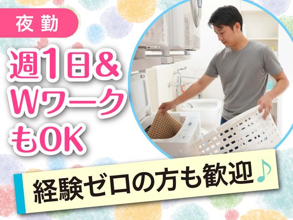 仕事内容 夜勤専従のお仕事が初めての方も大歓迎〇 まずは週1勤務で慣れたら週2勤務などもOK! 働き方はお気軽に相談を! 【お仕事内容】 入居されている方の自立支援をサポートするお仕事です。 介護が初めての方にも、1からサポートしますので安心して始められます。 【具体的には】 ・お食事準備やお話し相手 ・服薬管理 ・清掃、洗濯 ・消灯後の巡回(不眠時の入居者様支援) ・その他生活援助や見守り など ※介助が必要な方には食事・入浴・排泄の介助もお願いします。 ※お食事に関しては、献立が毎食決まっており、レシピもあります。 1からの調理ではなく、食材のカット・温め・盛り付けがメインなので、難しい調理作業はありません。 《夜勤の主な1日の流れ》 ・17:00~ 出勤 引継・夕食準備 ・18:00~ 食事介助 ・19:00~ 服薬・入浴介助・見守り・洗濯 ・21:30~ 巡回 ※入居者様不眠時のサポート ・6:00~ 朝食準備・食事介助 ・7:00~ 掃除・入居者様支援 ・9:00 退勤  ̄ ̄ ̄ ̄ ̄ ̄ ̄ ̄ ̄ ̄ ̄ ̄ ▶ 選ばれる理由について 【働きやすさ】 介護施設では高度な医療ケアや介護が必要な一方で、 障がい者グループホームでは、日常生活の生活支援が中心。 そのため介護施設に比べて3大介助(食事、入浴、排泄) の負担が少なく、身体的にも精神的にも 余裕を持って働くことができる環境です! 【初めての方でも安心】 “障がい者施設で働くのは初めて” という方もたくさん在籍しています! 「どんな方がいるのか」、「イレギュラー対応はどうするのか」・・・ そんな気持ちがわかる先輩ばかりなので安心してくださいね♪ 入社時の研修や、緊急時のマニュアル完備はもちろん、 希望者には入社前に施設見学も行っています!