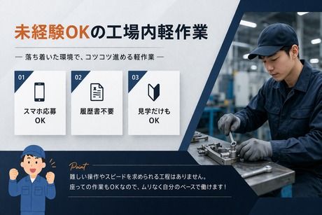 仕事内容 飛行機部品を扱う工場での物流のお仕事です 資格や経験は不要◎ 台車を使って部品を運ぶシンプル作業なので、 未経験でもすぐ慣れます! ■ 仕事内容 ・部品の受け入れ・簡単な検品 ・検査工程へ台車で運搬(検査はナシ) ・出荷先ごとに仕分けして指定エリアへ移動 重たい作業はほとんどありません! 決まった置き場に運ぶ作業なので、迷う心配もなし! ■ こんな方におすすめ 決まった場所に運ぶ作業があるので… ・散歩など体を動かすのが好き ・座りっぱなしより歩く方が向いている ・軽く運動するのが日課の方 上記に当てはまる方なら、楽しく働けます◎ ■ 勤務・待遇 ・土日祝休み ・長期休暇あり(年4回) ・年間休日130日以上 ・交通費支給 ・制服貸与/食堂・売店・ロッカー完備 ・週替わりの交替勤務(配属部署による) ・安定収入で働きたい方にもピッタリ ■ 応募のハードルなし! 「ちょっと面白そう」でもOK◎ 未経験でも、資格がなくても大丈夫! 面接で仕事内容や給与の詳細をしっかり説明します。 カウンセリング感覚で気軽にエントリーしてください。 ■ 面接方法が選べます ・会場面接:会社の雰囲気を直接チェック ・リモート面接:仕事の合間や在職中でもOK \\まずは話を聞くだけでもOK// 迷っている時間が一番もったいない! まずは話を聞いてみるだけでOK! 「違うな」と感じたら、その場で断っていただいて大丈夫! 応募は【応募ボタン】から1分ほどで完了。 面倒な入力はありません。 あなたのご応募を、お待ちしています。 業務の変更範囲:「会社の定める業務」
