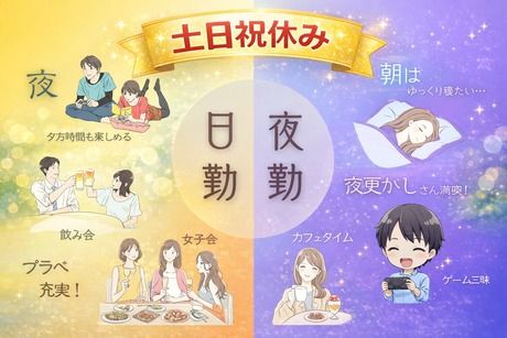 勤務時間 実働時間:8時間/日 平均勤務日数:1ヶ月あたり20日 ・勤務曜日:月・火・水・木・金 ・勤務時間: [1] 08:00~17:00 [2] 20:00~05:00 原則 土日祝休み ※社内カレンダーによる 休憩:60分 時間外労働:月あたり30時間程度あり ◇ネタバレ注意!実はメリットいっぱいの交替勤務♪◇ 深夜手当が発生してお給料もアップ! 日勤の日は同じ時間帯で働いている人と飲みに行けます! 夜勤の日はお昼に銀行や役所、行列のできるランチ店にも行けます♪ そしてみんなが働いている時間に休める優越感! 一度味わってしまうと「日勤には戻れない」との声も!