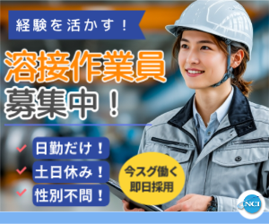 PR・職場情報 =====ここがポイント===== ■経験を活かす溶接作業員! ■週末しっかり土日休み! ■日勤だけワーク! ■お給料週払いも対応可! ==================== ▼安心のフォロー体制▼ 就業してからも当社営業スタッフがしっかりフォローしますので、派遣が初めての方や未経験のお仕事に不安のある方も安心してお勤めいただけます!! 20代~60代の年代の方が大活躍中!お仕事内容の問い合わせだけでもお気軽にどうぞ! / ・八色駅から車で3分! ・駐車場完備!喫煙所あり! ・社員食堂あり! ・派手でなければ髪色自由! \ 求人の特徴 【お仕事開始までの流れ】 STEP1: 営業社員との面談、登録 STEP2: 職場見学 STEP3: 入社書類取り交わし STEP4: お仕事開始 ※平日18時以降の面談やオンライン対応も可能です。ご希望の方は遠慮なくお問い合わせください! - この求人以外に派遣・バイト・アルバイト・パートや軽作業、製造、事務のお仕事に興味のある方、短時間、短期・長期歓迎です。南魚沼市、魚沼市、十日町市、湯沢町でお仕事をお探しの方、未経験、ハローワークでお探しの方もお問い合わせください。 - 〒949-6680 新潟県南魚沼市六日町479-3 テルエルクボタビル2F 株式会社 NCI 電話番号:0120-432-345 (※お電話にてご応募の際は「求人サイトを見て」とお伝えください!) 一般労働者派遣事業許可番号:派07-300732 職業紹介事業許可番号:07-ユ-300310