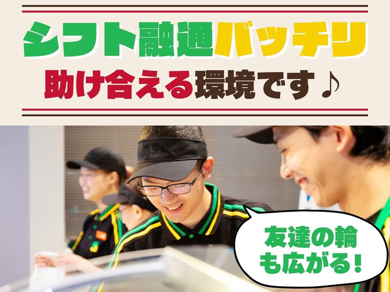仕事内容 ⭐時給UPしました!⭐  ̄ ̄ ̄ ̄ ̄V ̄ ̄ ̄ ̄ ̄ ̄ ̄ 更に!土日祝は時給+50円★ \ 働きやすさ抜群 / ** サブウェイ店舗STAFF募集 ** . ⭐オススメPOINT⭐  ̄ ̄ ̄ ̄ ̄V ̄ ̄ ̄ ̄ ̄ ̄ ✅週2日~・1日3h~OK! ✅未経験スタート大歓迎♪ ✅うれしい社割や特典も多数◎ ✅土日祝+1日3h~できる方急募! フリーで入れる方も大歓迎☆彡 ✅学生・フリーターさん活躍中✨ . ⭐主なお仕事内容⭐  ̄ ̄ ̄ ̄ ̄V ̄ ̄ ̄ ̄ ̄ ̄ 大人気!「サブウェイ」にて サンドイッチ作りや ドリンクの提供をお願いします! ✅マニュアル通りに要望を聞く …「パンの焼き加減」「抜く具材」など 簡単な質問でお客様のご要望を伺います♪ ✅希望通りにパンへ具材を挟む …具材のカットや揚げ物等はありません! 「ただ挟むだけ」のシンプルな作業! ✅サンドイッチをくるっと包んで提供! …「ドリンクだけ」のお客様もいます◎ . / サンドイッチで、 お客様を笑顔に \ 自分だけのオリジナルサンドイッチ が作れる、大人気チェーン店【SUBWAY】! 「サブウェイで人生初バイトデビュー!」 そんな先輩も多数活躍中です♪ 優しい店長や先輩が しっかりサポートします! お友達同士の応募も大歓迎⭐ 主婦さんも活躍中です! シフトも助け合える環境です。 「学業と両立しながら働きたい!」 「家事・育児の合間にちょこっと稼ぐ」 「Wワークでがっつり稼ぎたい」 など…色んな働き方が実現できるお店です! 学校行事や家庭の事情などでの お休みやシフトの相談ももちろんOK♪ / まずはお気軽に ご応募ください⭐ \