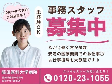 仕事内容 \ 本求人について♪ / 病院裏方×事務職のお仕事◎ 新しい環境で働いてみませんか?  ̄ ̄ ̄ ̄ ̄ ̄ ̄ ̄ ̄ ̄ ̄ ̄ ̄ ̄ ̄ ̄ ̄ ̄ ̄ ̄ ★★ 勤務地までのアクセス詳細 ★★ 愛知県豊明市沓掛町田楽ケ窪1番地98 (藤田医科大学病院での勤務) ・ジンキャスト専用駐車場の利用OK ※前後駅・鳴子北駅・徳重駅・ららぽーと愛知東郷よりバス通勤も可  ̄ ̄ ̄ ̄ ̄ ̄ ̄ ̄ ̄ ̄ ̄ ̄ ̄ ̄ ̄ ̄ ̄ ̄ ̄ ̄ お仕事番号『P1842M-99』 お問い合わせの際は番号をお伝え いただけるとご案内がスムーズです。 JCST-FG 【 お仕事詳細 】 ★地域連携室での事務★ ・紹介患者の予約入力 ・医師の代行入力 ・紹介状の改修 ・院内外の電話対応 など *・。*・。*・。*・。*・。*・。 医療業界の経験は問いません! 何らかの事務経験があればOK^^ 1年かけてじっくり教えてもらえる♪ *・。*・。*・。*・。*・。*・。 <部署・同業務者の年齢層> 20代、30代、40代、50代(女性) ☆ジンキャストなら…☆ お仕事内容の詳細・環境情報などを 事前に詳しくお伝えさせていただき 「こんなはずじゃなかった…」を 無くすお手伝いをいたします♪ ■無料のパソコン研修あり ■給与週払いサービスあり ■ひとり親特別手当あり ■資格取得支援あり etc. 【 職場の雰囲気・身だしなみ 】 ■職場の雰囲気 ・明るく活気あり ■身だしなみ ・服装自由 (オフィスカジュアル) ・髪型・髪色自由 (黒~暗めブラウン推奨) ■お昼休憩の取り方 ・院内で食べる方が多め ■その他 ・転勤なし(転居の心配なし) ・育休・産休取得実績あり ・家庭都合休OK ・子育てママ、主婦活躍中 /// 勤務開始日・募集人数 /// ■勤務スタート目安 ・即日勤務OK (スタート時期の相談OK) ■勤務期間 ・長期 ■募集人数/背景 ・欠員募集(1名以上)