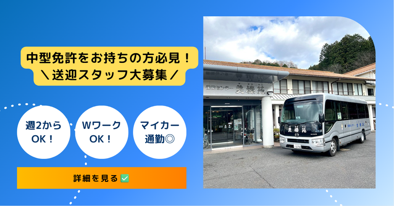 仕事内容 ◇奈良県宇陀市にある温泉旅館 奈良県宇陀市にある温泉旅館 「美榛苑(みはるえん)」で、 送迎業務をお任せできる方を募集します! https://www.miharuen.jp/ ⭐ 具体的には・・・ ⏩ 定期バスの送迎業務(メイン) ・朝9:30〜夕方17:30の送迎対応 ・安全運転でご利用者様を施設まで送迎 ⏩ 宴会の送迎対応(昼 or 夜) ・昼・夜いずれかの時間帯で4時間程度 ・宴会・法要の出席者の送迎 ・日によって変動あり(最大22時まで) ⏩ 施設内の簡単な庶務・軽作業 ・電球交換などの簡単な設備対応 ・備品の補充 ・施設周りの簡単な整理整頓 《業界・職種未経験の方歓迎!》 ★先輩スタッフがフォローするので 未経験でも安心してスタートできます◎ 《ここがポイント》 ★マイカー・バイク通勤OK! 駐車場あります(無料) ★フリーターやWワークさんなど幅広い 年齢層が活躍中!