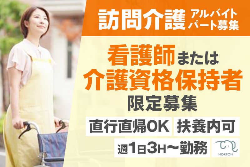 【仕事内容】 ★週1~/時短OK★訪問介護ヘルパーのパートアルバイト募集! ※いずれかの資格をお持ちの方限定※ 初任者研修以上/介護福祉士/看護師・准看護師 \10秒でわかる HORTON の特徴/ ──────────────────── 【未経験OK】研修・資格支援等あり 【柔軟シフト】24Hのシフト制・週1~/3H~ 【相談OK】扶養内勤務・稼ぎたい等相談OK 【直行直帰可】通常1日1訪問(通勤考慮) 【充実の研修】約3か月の研修あり 【待遇充実】社員登用、退職金積立等あり 【嬉しい福利厚生】GYYM(ジムの都度利用サービス)利用可 ──────────────────── 《訪問介護ヘルパーの仕事とは?》 重度障がい者宅への訪問介護ヘルパー業務をお願いいたします。 ■身体介護(食事/入浴/排泄/着替え 等) ■生活援助(掃除/調理/洗濯 等) ■医療的ケア(喀痰吸引/経鼻経管栄養) ■報告書作成業務 ※業務負担を軽減するため、報告書は訪問先でアプリを使用して簡単に作成できるようになっています ▷出社は月1回のみ ▷サポート体制:随時メール・ミーティング対応可能 訪問介護ヘルパーが未経験の方でも、TOTAL20時間の研修があり安心してスタートできます! 自律し、自分のペースで作業に取り組みたい方に向いている環境です♪ 《月収イメージ》 扶養内・短時間勤務・ガッツリ働きたい等、ご相談下さい! ① 18:00~22:00×12日=81,024円 ② 09:00~15:00×10日=96,000円 ③ 14:00~21:00×20日=263,040円 ▼経験者、下記時間帯は時給UP▼ 夜勤帯(22:00〜05:00)/2,000円~ 朝勤帯(05:00〜08:00)/1,800円~ 夕勤帯(18:00〜22:00)/1,800円~ ※研修期間(最長3ヶ月)/時給1,226円~ 【未経験でも安心の研修ステップ】 ・法令順守やコミュニケーションなど、基礎を学ぶ内部研修 ・重度訪問介護従業者養成研修の受講(会社負担) ・ 先輩とペアでの現場研修 ▶3~4ヵ月かけてじっくり学ぶことができます 《HORTONについて》 訪問介護を通してケアが必要な方が心から満たされる日常生活を送れるよう支援しています。 20代~50代の幅広い世代が活躍中で、みんな優しく思いやりある方ばかり♪ やりがいも持ちながら長く働ける職場です。 訪問介護ヘルパーとして私たちと一緒に働きませんか?