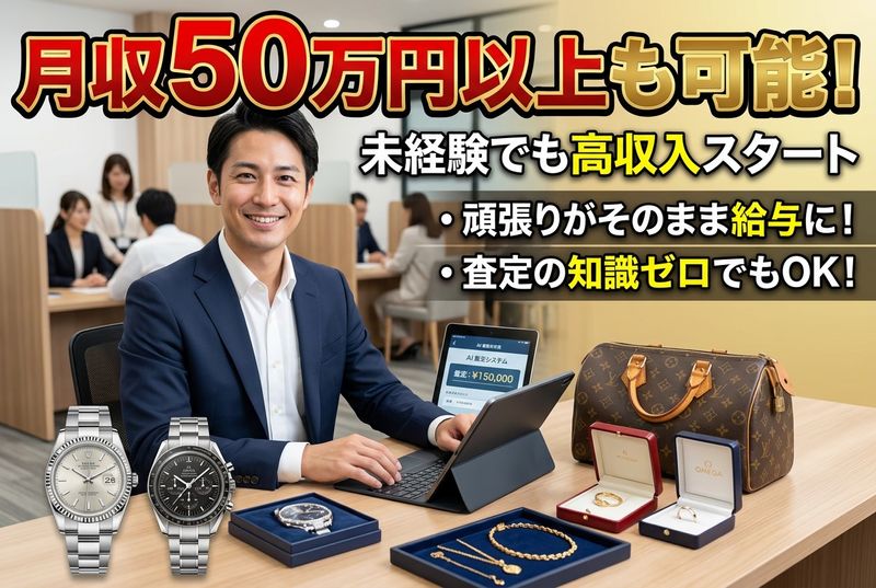 仕事内容: 《月給》月給40万円~ 12月度平均月収92万円 ※年齢・経験を考慮の上、当社規定により決定します 平日1日+日祝休み(完全週休二日制) ・年末年始休暇 ・夏季休暇 ・GW休暇 【仕事内容】 金・プラチナ・ジュエリーなどの貴金属を中心に、お客様がお持ちになったお品物の価値を確認し、最適な買取のご案内を行うお仕事です。 単なる買取ではなく、お客様のご事情やご希望をお伺いしながら、納得いただける形で取引を進めていきます。 【具体的な業務内容】 ・お客様対応・ご案内 ・お品物の確認およびヒアリング ・査定内容の確認(専門部署と連携) ・買取価格のご説明・ご提案 ・成約後の手続き対応 査定は本部や専門スタッフのサポートがあるため、未経験の方でも安心してスタートできます。 【この仕事の特徴】 ・高単価商材を扱うため、1件ごとの影響が大きい ・お客様との信頼関係が重要な仕事 ・知識と経験が積み重なることでスキルアップできる 【この仕事の魅力】 ・貴金属やジュエリーに関する専門知識が身につく ・成果がしっかり評価される環境 ・未経験からでも段階的に成長可能