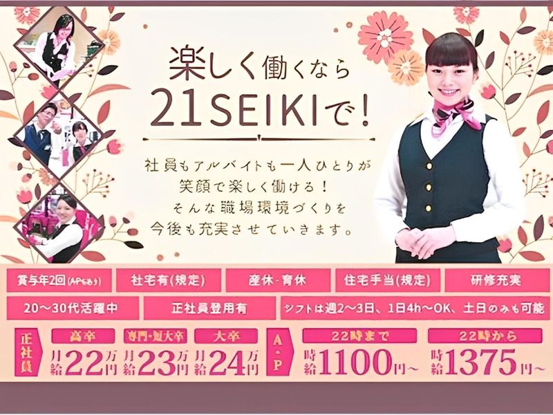 仕事内容 / ⭐月給22万円以上+賞与年2回+手厚い手当あり ⭐社宅完備!県外問わず県内の方でも利用できる福利厚生 ⭐社員食堂あり!毎日の食事に困らない社内体制 \ 【仕事例】 ・店内のご案内 ・カンタンな清掃 ・景品交換 など ◆業界未経験大歓迎! 入社後は、来店したお客様の接客対応をメインにお任せします。 インカム(無線機)完備でスタッフ同士連携できるので、 困ったことはすぐにフォローし合える環境です! 先輩がついて業務を1つ1つ丁寧に教えますので、 未経験でもご安心ください! マナーの基本からパチンコ接客の極意まで少しずつ覚えていけば問題ありません♪ 慣れてきたら、遊技機の調整やスタッフ育成、店舗運営なども徐々にお任せしていきます◎ ◆きめ細やかな育成プログラムあり! 21SEIKIグループは、接客やマナーの研修にも力を入れております。 入社後には、接客マナーの研修からはじまり、 応対のシミュレーションなど丁寧にトレーニングを行っていきます。 OJTを通じて、先輩社員の丁寧な指導を受けられるので、成長を実感できる環境です✨ 先輩スタッフから一言!  ̄V ̄ ̄ ̄ ̄ ̄ ̄ ̄ ̄ ̄ 業務的なことはもちろん、社会人としての姿勢を大切にしている職場です! お客様のしぐさから察して、お客様の「こうしてほしい」を先回りして気付けるように心がけています。 また、お客様との会話から広がるつながりが嬉しいと感じています♪