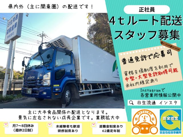 仕事内容 店舗納品はカゴ台車中心でスムーズ。 21時スタートの夜型ルート配送です。 残業代100%支給・平均月収34万円以上の安定収入。 \普通免許からもスタート可能/ 資格支援制度(規定あり)を利用し、働きながら中型・大型免許を取得できます。 教習所に行っている期間中も給与発生しますので安心! 【研修制度】 研修専門のスタッフが(運転・座学)を独り立ちできるまでしっかりフォロー。 未経験の方も約3ヶ月程度でドライバーを目指せるシステムです。 免許取得まで座学や荷扱いなど行い、免許取得後から運転の知識を研修します。 \お気軽にお電話も歓迎!/ TEL/048-777-6488(正社員ドライバー採用係) 【職種】 〇ルート配送ドライバー ▼ルートドライバーの注目ポイント▼ 〇長時間運転なし 〇月額302,780円~各種手当あり 〇平均月収346,544円(在籍340名) 〇残業代は別途全額支給 〇月7~8日はしっかりお休み 〇不況にも負けない安定した仕事量 〇複数の資格支援制度有→例)中型免許へのステップアップなど 〇働きやすい職場認証制度取得 〇30代・40代・50代活躍中! ///////////////////////////////////////////////////////////////// 【仕事内容】 【仕事内容】 4tトラックを運転して路面店などに食品を配達するお仕事です。 埼玉県内と埼玉県周辺エリアが中心。 固定ルートのため、一度覚えればルーティンワークとして働けます。 ・1日の配送件数:10店舗程度 ・カゴ台車使用/検品なし 店舗納品はカゴ台車中心。 積み込み時に一部手積み作業はありますが、 置き配のため納品作業はシンプルです。 重い荷物を長時間持ち続ける作業や、店舗ごとの検品・仕分け作業はありません。 〇1日の流れ (1)営業所・物流センターで積み込み (2)2~3店舗へ配送 (3)センターに戻り再積み込み (4)1日2~4往復程度 【独り立ち後】 はじめは2~3便を担当して、スキルに合わせてコースを増やすなどステップアップ可能です。 独り立ち後も会社でバックアップしていきます。 未経験の方は極力日勤帯のお時間をご案内しております。 【採用ホームページはこちら】 日生流通運輸倉庫株式会社 https://entori.jp/nissei-ryutsu-seishain