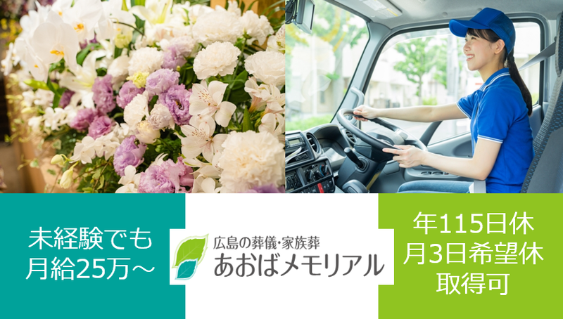 求めている人材 【必須】 □普通自動車運転免許(AT限定可) 【歓迎】 □学歴不問 □未経験の方 □第二新卒 □業種・職種未経験の方 □フリーター □配送の経験をお持ちの方(業界不問) □生花のアレンジメント経験をお持ちの方 【優遇】 □資格保有者 □葬儀業界での経験をお持ちの方 \ こんな方にオススメ! / ✨コツコツと作業に取り組みたい方 ✨人と話すことが好きな方 ✨チームワークを大切にしている方 \ ジョブチェンジも可能です / 入社後、ご本人の希望と 会社の意向をすり合わせた上、 他の仕事にも挑戦いただける 可能性もございます。 現在『葬祭ディレクター』 『日勤ドライバー』 『湯灌・納棺師』の 採用もしておりますので 気になる職種がございましたら ご相談ください!