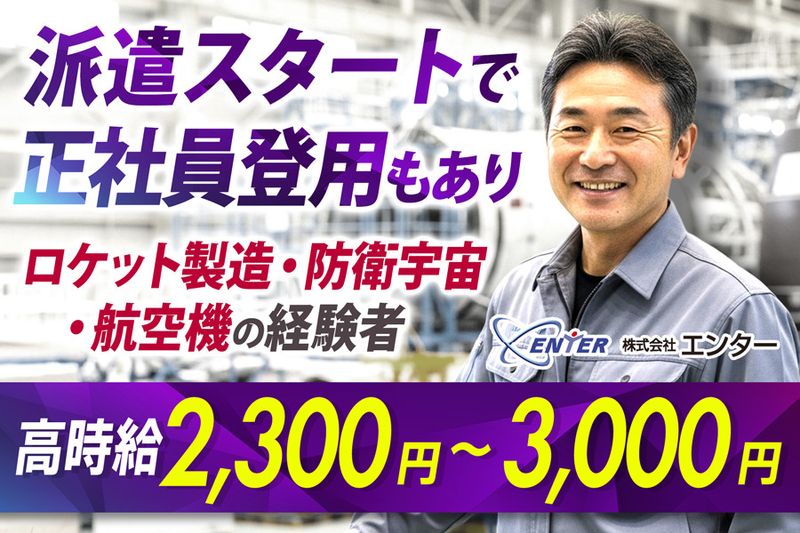 ✅経験者募集/ロケット製造/防衛宇宙/航空機✅時給2,300円~3,000円✅正社員登用あり✅二交代