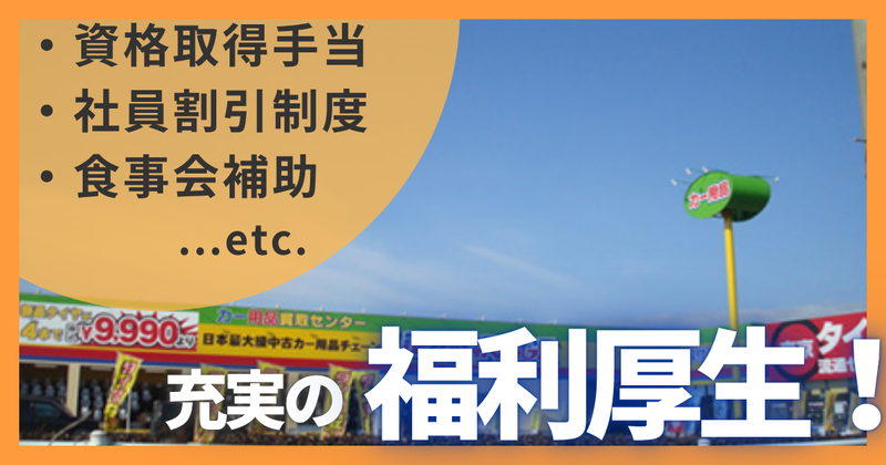仕事内容 ✅車やバイクをいじるのが好き ✅地元で働きたい!! ✅時給のいいバイトがしたい そんな高校生・大学生のあなたが楽しく働ける環境がここに!? 授業が無い日や土日のお休みなどを活用して楽しく働けます!! またなんと時給は1,200円!(繁忙期はさらに1,300円!) バイトからの正社員登用もできるので、 職場が好きになったら正社員としても活躍できます!! 【仕事内容】 店頭に来店されたお客様への接客業務や買い取り業務、 タイヤ交換をおこないます! 「このホイール、うちの車に合いますか?」など、 お客様のちょっとした疑問やこだわりに寄り添いながら、 商品をご提案していきます。 陳列や売り場づくり(POP作成、ディスプレイ)も ゆくゆくはお任せします! また、買取業務ではお客様が持ち込んだカー用品や バイクパーツなどの買取査定を行います。 商品のキズや汚れ、使用年数などを確認し、 買取金額のご提示・交渉対応をおこないます。 納得いただける金額の提示やこの人に任せても良いかな と思ってらえる接客が大事になってきます! 知識や経験のない方もご安心ください。 いきなり全てを任せることは無く段階別で覚えてもらいます! 先輩社員が丁寧に教えますので、安心して働き始められます!