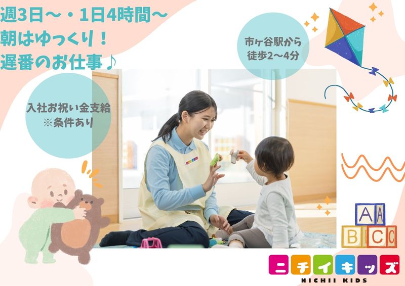 【Point オススメポイント】 ・JR市ヶ谷駅徒歩4分!南北線市ヶ谷駅徒歩2分、通勤にとっても便利な職場です。 ・定員30名、広いゆったりとした保育室で、 スタッフ同士声を掛け合いながら保育しています。 ・新宿区にありながら園の周りは自然が豊かで、四季を十分に感じられます! ・周囲には公園や遊歩道、広場などがあり散歩にもよ季節が良く天気の良い日にはたくさん外遊びをします。 ・製作や食育にも力を入れています! でも、持ち帰り仕事はゼロなのでプライベートも充実できますよ? ・ICT化を進めています。帳票類は効率的に入力が出来ます♪ 【入社お祝い金について】 以下の2点を全て満たす方を対象に、入社お祝い金を支給! ①月120時間以上の勤務が可能 ②早番・遅番等のシフト勤務が可能 ※その他支給にあたり当社規定あり 詳しくは採用担当までお問い合わせください♪ 【Message 採用担当者より】 ★★園長コメント★★ 0歳児から2歳児の定員30名の企業型保育園です。 新宿区にあり、周りには緑が多く四季をしっかり味わえる環境にあります。 公園も多く、毎日元気いっぱいに子ども達はお散歩に出掛けています。 若い職員が多く元気で明るい保育園で子ども達も職員も笑顔がいっぱい!! 分からない事があれば気軽に聞くことが出来、 丁寧に教えてくれ、助け合いながら成長していけますよ。 是非、私たちと一緒に働きませんか。 【おすすめポイント】 ニチイキッズは全国に約350拠点の保育園や子育て支援施設を展開しています。 保育理念は「おもいっきり遊ぶ。 おもいっきり学ぶ。」 子どもたちが”おもいっきり”のびのびと活動できる環境や活動内容を 先生たちみんなで考え作る保育園となっております。 また、ニチイキッズのもう一つの取り組みとして、”おもいっきり給食”があります。 「おもいっきりみんなで食べられる給食」という給食方針を元に 基本的には3大アレルゲン【卵・小麦・牛乳】を使用しない献立となっております♪ アレルギーのある子もお友達と一緒に楽しくお給食を食べることができます! ニチイキッズの”おもいっきり”を気軽に体験しに来ませんか? 園見学でお待ちしています! ★ニチイキッズの魅力★ ・年間休日120日以上 ・残業代は1分単位で支給 ・多彩な休暇制度(家族愛休暇、子の介護休暇など) ・産休、育休取得割合が高水準 ・47都道府県に様々な保育サービスを展開しています。 【応募方法】 選考をご希望の方、または「まずは園見学から」という方は、 【応募する】ボタンからお気軽にご応募ください。 採用担当より、面接・園見学日程調整をさせていただきます。 面接は、予約枠からご希望の日程で予約も可能です!(オンライン面接も実施中) 【お問い合わせ先】 関東第二支部 人材課 TEL03-5909-3161。