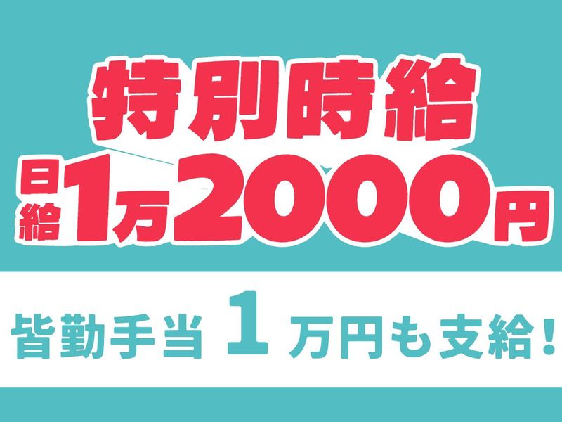 日給12,000円 給与詳細 基本給:日給 1万2000円 固定残業代:なし 【一律手当】 全員に一律で支払われる通勤・皆勤・家族手当金額:なし 全員に一律で支払われるその他手当金額:なし 入社1か月は【特別日給1万2000円!!】となります ▶以降は日給1万450円 ◇昇給あり ◇賞与(年2回)