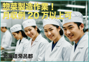 惣菜製造作業!月収例20万以上可★未経験の方歓迎!20代~60代の男女活躍中/空調完備で働きやすい環境です!日勤専属&残業少なめで予定も立てやすい♪人気の日払い制度あり!マイカー通勤OK!《北海道常呂郡訓子府町》