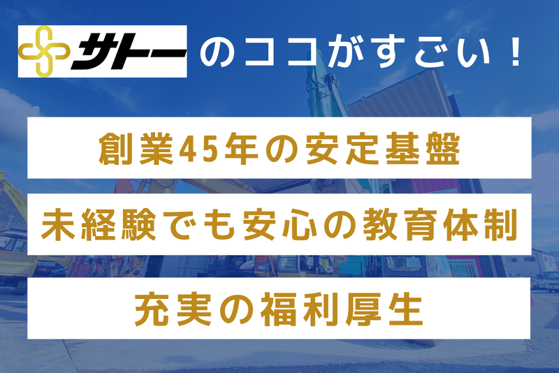 アピールポイント: 【創業45年の安定基盤】 建設機械レンタルのプロとして、地域のインフラを支える当社。最大の魅力は「営業のしやすさ」です。 ノルマはなく、既にお取引のあるお客様を回るルート営業がメイン。 「ガツガツ売る」のではなく「顔を覚えてもらう」ことからスタートでき、未経験の方もプレッシャーなく始められます。 【未経験でも安心の教育体制】 研修に期限はありません!あなたが自信を持てるまで、先輩がマンツーマンで並走します。 知識ゼロからでも月給28万円以上をお約束。 【働きやすさも抜群】 17時定時で、夜は家族や趣味の時間を大切にできます。 家賃補助や資格取得支援など、生活を支える手当も充実。 「腰を据えて長く働きたい」という方に最適な環境です。