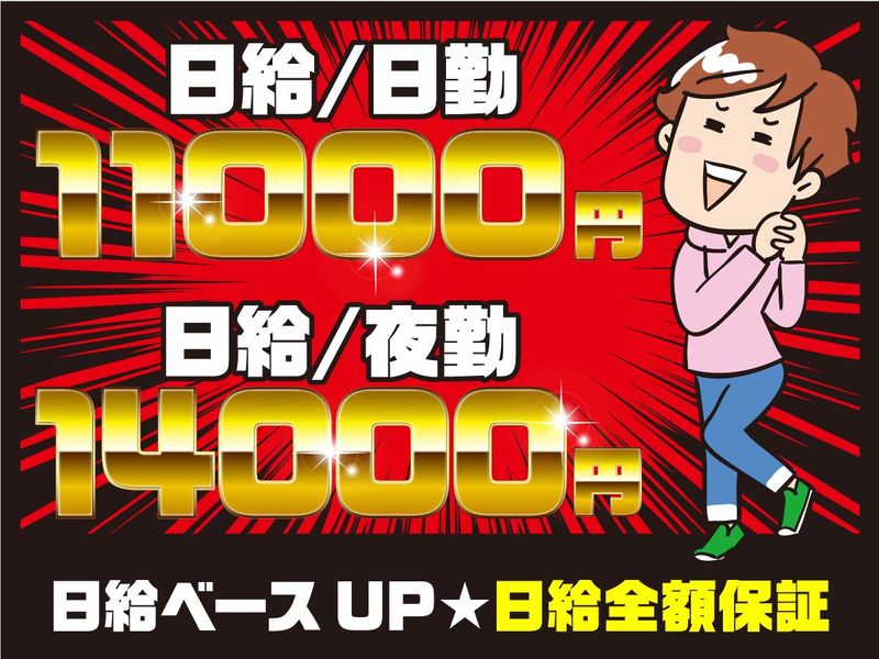 日給11,000円以上 給与詳細 基本給:日給 1万1000円 〜 固定残業代:なし 【一律手当】 全員に一律で支払われる通勤・皆勤・家族手当金額:なし 全員に一律で支払われるその他手当金額:なし 【日勤】1万1000円~ 【夜勤】1万4000円~ ★早上がりでも全額日給保証!★ ★日払いOKで翌日収入GET!★ 【給与例】 給与例 ■週5日/夜勤のみ ・日給1万4000円×22日 ⇒月収30万8000円 ■週3日/日勤のみ ・日給1万1000円×12日 ⇒月収13万2000円 ■週3日/日勤&夜勤 ・日給1万1000円×6日 + ・日給1万4000円×6日 ⇒月収15万円 ※上記目安金額となります。
