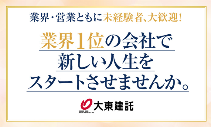 仕事内容 ▼この求人のここがPOINT ✨創業50年、売上高1兆円超えの東証プライム上場企業 ✨大東建託グループは賃貸住宅の供給・管理・仲介で業界No1のリーディングカンパニー! ✨2025年4月には、2年連続、全従業員の給与のベースアップを実施! ✨営業職(担当クラス)の平均年収879万円(2024年度実績) ✨誰でも狙える「新人賞」で初年度から大幅年収UP可能! ✨業界1位のノウハウが詰まった充実の研修制度でスキルUP可能! ✨年間休日125日! ✨誕生日や結婚記念日など特別な日に取得できるアニバーサリー休暇あり! ✨男性育児休業取得者100%、有給取得率80%以上! ✨フレックスタイム制度導入で働きやすい環境◎ 【仕事内容】 空き地や農地、駐車場、古借家などの土地を持つお客さまに、アパートや賃貸マンションの建築・運営を提案する営業です。一人のお客さまと何度もお会いして、交流し、信頼関係を深めていきます。 <仕事の流れ> step.01 訪問(初訪~再訪) 担当するエリア内のご家庭(土地オーナー様)のもとに定期的に訪問。 まずは世間話などをしながら、エリアの担当であることを知っていただきます。 少しずつ、距離を縮めていきながら、例えば「先祖代々から受け継いだ土地や建物をどうしたらいいか…」などのお悩みや困りごとを引き出していきます。 step.02 プラン策定・打合せ ヒアリングした内容を上司に報告。オーナー様の困りごとを解決するためのプランを一緒に考えます。 step.03 商談 考えたプランを持ってオーナー様のもとへと上司と一緒に訪問。 分からないことがあっても大丈夫。必ず上司が同行してフォローするので、安心して商談に臨めます。 step.04、ご契約 契約が完了して工事が始まってもオーナー様とのお付き合いは続きます。 工事が完了するまでサポート。「ありがとう」と言われる最高の瞬間がここにあります。 ★訪問できるお客様の数が増えれば増えるほど、確実に報酬UPの確率を上げることができる仕組み! オフィスにこもっているより、どんどん外にでて行動した方が結果を残しています。 【研修・育成体制】 ✅業界1位のノウハウが詰まった充実の研修制度 研修は入社後すぐにスタートし、本社と支店の両輪で実施。 年次や個人のスキルに合わせて、継続的に育成プログラムが組まれており、段階的な知識・スキルの装着が可能。 法律や国家資格取得に必要な知識も学ぶことができ、キャリアの幅が広がります。 ・導入研修:本社の教育選任トレーナーが名刺の渡し方から、税金・建築知識など基本的な知識のインプットをサポート ・営業研修:プラン提案力など地域別で毎月実施 ・事業部強化研修:地域特性を活かした情報インプットの定期実施 上記の他にも、年次や個人のスキルレベルに合わせた各種研修をご用意しております。 【頑張ったら頑張った分だけ収入UP可能】 営業で成果を上げれば上げた分だけ、しっかり収入に反映される仕組みがあります。 年2件の契約で年収1,000万円超えの例も・・・! 《例》契約金額1億円の案件(狙える歩合給:約200万円/概算)×年2回契約 また、歩合給の他に入社をすると誰でも狙える新人賞があります。入社後、経過した期間によって最大50万円支給。 自分の頑張り次第で、収入をいくらでも上げられる!頑張るモチベーションが続く環境があります。