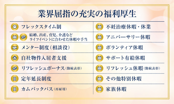 休日休暇 ★年間休日125日 週休2日制 └基本土日祝休み (お客様都合などによる土日出勤の可能性有) 【休暇制度】 ・夏季休暇 ・年末年始休暇 ・アニバーサリー休暇 ※誕生日や結婚記念日など特別な日に休暇を取得できる制度 ・慶弔休暇 ・産前・産後休暇 ・育児休暇 ・介護休暇