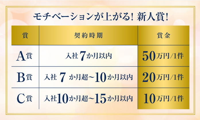 月給302,000円以上 給与詳細 ※基本給・固定残業代・一律手当の総額 基本給:月給 20万9000円 〜 固定残業代:あり 1ヶ月あたり6万3000円 〜(固定残業時間:1ヶ月あたり35時間) 固定残業時間を超えた勤務時間については別途残業代を支給する 【一律手当】 全員に一律で支払われる通勤・皆勤・家族手当金額:なし 全員に一律で支払われるその他手当金額:あり 1ヶ月あたり3万円 ★平均年収/2024年度実績★ ●全従業員:918万円 ●営業職(担当クラス):879万円 ★誰でも狙える!新人賞★ ●新人賞A 入社7か月以内なら1件契約ごとに50万円 ●新人賞B 入社7ヶ月超~10ヶ月以内なら1件契約ごとに20万円 ●新人賞C 入社10ヶ月超~15ヶ月以内なら1件契約ごとに10万円 【給与例】 給与例 【年収例】 2500万円/入社4年目(月給36万円+歩合給+賞与) 1890万円/入社3年目(月給36万円+歩合給+賞与) 700万円/入社1年目(月給28万円+歩合給+賞与)