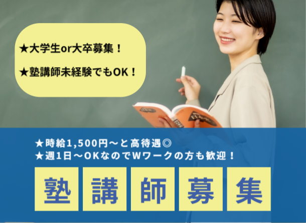 仕事内容 【おすすめポイント】 ⏩未経験から先生になれる! 充実の研修で安心スタート◎ ⏩週1日~、1コマ90分~勤務OK! ⏩平日のみの勤務OK ⏩大学生・主婦・主夫さん大歓迎✨ ⏩副業やWワークもOK! スキマ時間に効率よく稼げます◎ ⏩髪色・ネイルも派手すぎなければOK! ⏩正社員登用制度あり! ◆・◆・◆・◆・◆・◆・◆・◆・◆・◆・◆・◆・◆ ✅お仕事内容  ̄ ̄ ̄ ̄ ̄ ̄ ̄ ̄ ̄ ̄ ̄ ̄ ̄ ̄ ̄ ̄ ̄ あなたのペースに合わせて、 中学生の学習サポートをお願いします。 子どもたちの「わかった!」が嬉しい、 やりがいのあるお仕事です◎ ✅未経験でも安心!お仕事の流れ  ̄ ̄ ̄ ̄ ̄ ̄ ̄ ̄ ̄ ̄ ̄ ̄ ̄ ̄ ̄ ̄ ̄ STEP1:丁寧な研修からスタート! まずは、授業の進め方や 生徒とのコミュニケーションのコツなど イチから丁寧にお教えします。 しっかりとしたマニュアルもあるので 未経験の方もご安心ください。 STEP2:得意な1科目から先生デビュー! 最初は5人以下の少人数からスタートして、 徐々に慣れていきましょう。 授業前にその日の内容を少し予習し、 テキストに沿って教えれば大丈夫◎ STEP3:生徒の「わかった!」を引き出す 生徒が問題を解いている間は、 丸付けをしたり、 「この問題、わかるかな?」と 声をかけたりします。 あなたの言葉で、生徒の「わかった!」 という表情が見られた時が、 一番のやりがいです! 困った時はいつでも相談! 先輩講師や教室長が常に周りにいます。 わからないことがあれば すぐに質問できる環境です。 安心して授業に集中できますよ。 ✅担当科目例  ̄ ̄ ̄ ̄ ̄ ̄ ̄ ̄ ̄ ̄ ̄ ̄ ̄ ̄ ̄ ̄ ̄ 中学生:英語、数学、理科、社会、国語 ★得意な1科目からでOK! 「数学だけ」「英語だけ」など、 あなたの好きな科目を選べます。 ✅成長に合わせた時給アップ制度  ̄ ̄ ̄ ̄ ̄ ̄ ̄ ̄ ̄ ̄ ̄ ̄ ̄ ̄ ̄ ̄ ̄ 最初は5人以下の少人数からスタート◎ 10人以上の指導が 問題なくできるようになれば、 時給2000円~に昇給します! 将来的には最大20名程度の集団授業も 担当していただけます。 ✅社員登用制度あり  ̄ ̄ ̄ ̄ ̄ ̄ ̄ ̄ ̄ ̄ ̄ ̄ ̄ ̄ ̄ ̄ ̄ 講師として経験を積んだ後は、 教室運営にもチャレンジ可能です。 長期的なキャリアアップを 目指すことができます。 ✅こんな方にピッタリ!  ̄ ̄ ̄ ̄ ̄ ̄ ̄ ̄ ̄ ̄ ̄ ̄ ̄ ̄ ̄ ̄ ̄ ⭐子どもが好き、人と話すのが好きな方 ⭐未経験から「先生」に挑戦したい方 ⭐誰かの役に立っていると実感したい方 ⭐大学と両立したい学生さん ⭐家事や育児の合間に 働きたい主婦・主夫さん