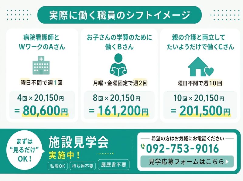 【勤務地】 住宅型有料老人ホーム たいよう 片江館 〒814-0143 福岡県福岡市城南区南片江2丁目13-25 ※自動車・自転車・バイク通勤可 ------------------------------------------------- 【休日・休暇】 シフト制 ※希望休も通りやすいです✨ ↓↓実際に働く職員のシフトイメージ↓↓ ・病院看護師とWワークのAさん 曜日不問で週1回 4回×20,150円=80,600円 ・お子さんの学費のために働くBさん 月曜・金曜固定で週2回 8回×20,150円=161,200円 ・親の介護と両立してたいようだけで働くCさん 曜日不問で週10回 10回×20,150円=201,500円 ------------------------------------------------- ✨まずは“見るだけ”OK!施設見学会✨ 「たいよう」を知ってもらうための 施設見学会を開催しています! 私服参加OK!持ち物は不要です! 希望の方は092-753-9016まで! 見学応募フォームはこちら https://www.taiyouhome.com/entry/ ------------------------------------------------- <必須条件> 初任者研修 実務者研修 介護福祉士 正看護師 准看護師 ※上記いずれか必須 <こんな方も歓迎!> ブランクがある方 施設未経験の方 介護士・看護師でWワーク先をお探しの方 ------------------------------------------------- 【会社概要】 ・企業名:株式会社ttt ・設立年月日:2015年7月 ・従業員数:687名(2025年5月現在) ・所在地:福岡県福岡市中央区舞鶴2-1-10 天神フロントスクエア5F <事業内容> 住宅型有料老人ホーム 「たいよう」「オリーブ」運営、 デイサービス事業、訪問介護事業など。 福岡佐賀にて計19施設を展開しています。 <有料老人ホームたいよう> https://www.taiyouhome.com/ ------------------------------------------------- ⭕応募後の流れ⭕ ✅「応募画面へ進む」よりご応募ください ↓ ✅担当より日程の連絡をさせて頂きます ↓ ✅面接実施 ↓ ✅採用決定のご連絡 《電話でのお問い合わせ》 092-753-9016(採用担当:福盛)まで 「求人を見た」とお問合わせください。