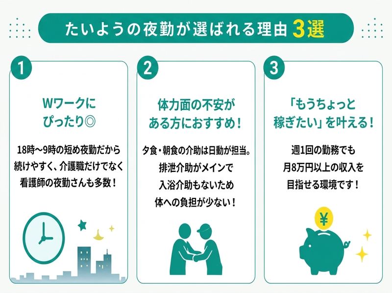 仕事内容: 【あなたはいくつ当てはまりますか?】 ✅夜勤のWワーク先を探してるけど16時スタートはちょっと早いなと感じる方 ✅看護師だけど介護施設での経験も積んでみたい方 ✅夜の時間を使って効率よく稼げる Wワーク先を探している方 ✅できるだけシンプルな業務で淡々とこなしたい方 ✅月の収入があと8万円増えたら嬉しい方 ↓↓ たいようなら、実現できます ↓↓ ≫≫≫≫アピールポイント≪≪≪≪ ✨実はWワークにぴったりな、たいようの夜勤✨ 16時スタートの夜勤や、朝11時までの夜勤だと Wワークをするにはちょっと大変。 たいようは18時~9時と短めだから続けやすいため、 介護士だけでなく看護師の夜勤さんも多いです◎ ✨実は、体力面の不安がある方におすすめ✨ なんと、夕食・朝食のどちらも 介助は日勤の職員が担います。 排泄介助がメインのお仕事で、 もちろん入浴介助もないため 体への負担も少ないです! ✨「もうちょっと稼ぎたい」を叶える✨ 「お子さんの進学でお金がかかる」 「自分の趣味を我慢したくない」 たいようでは"たったの週1回"勤務するだけでも、 月8万円以上の収入を目指せる環境です! ------------------------------------------------- 【仕事内容】 住宅型有料老人ホームにて 介護夜勤業務をお任せします。 <具体的に> お薬の手伝い、各居室への送迎 排泄のお手伝い・巡視 フロア清掃・衣類洗濯 など... <前半の勤務> 18:00 ~ 20:00 申し送り・巡視 20:00 ~ 21:00 トイレ・服薬介助 21:00 ~ 23:00 フロア清掃・洗濯 23:00 ~ 1:00 休憩 <後半の勤務> 1:00 ~ 6:00 巡視・トイレ介助 6:00 ~ 8:00 起床の手伝い ~ 9:00 申し送り・退勤 -------------------------------------------------