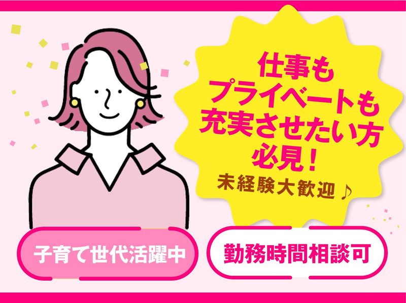求めている人材 経験・年齢不問 挨拶がしっかりできる方であれば大歓迎! もちろん全くの未経験者さんも大歓迎です! *女性多数活躍中! *子育て世代、主婦・主夫さん活躍中 \以下の方は歓迎!/ 未経験の方、フリーターの方、業界経験者 ブランクのある方、社会人デビューの方 長期で働きたい方、久しぶりの社会復帰の方 新しいことを始めたい方、家庭と両立して働きたい方 しっかり休みたい方、コツコツもくもく作業が好きな方 主婦パートやアルバイトをお探しの方 ハローワークで求職中の方 \こんな方にピッタリ!/ 安定して働きたい方 仲の良い職場環境で働きたい方 子育てがしやすい職場で働きたい方 ================