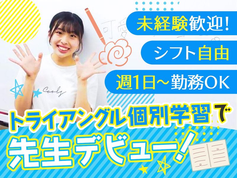 仕事内容 ☆。・-** 「テストの点数が上がった!」 「スラスラ解けるようになった!」 ――子どもたちからの そんな声が嬉しい♪ 子どもたちの将来を全力で応援する 『塾講師』として あなたの“得意”を活かして働きませんか? ☆。・-** \\魅力ポイント// ★得意科目や1科目のみでもOK ★生徒と塾講師の距離が近く、楽しい! ★週1日・1日1コマ(80分)~OK ★ラフな私服でOK!保護者対応ナシ ★シフト自由!プライベート充実◎ ――・――――・――――・――――・―― 【業務内容】 オンライン授業と対面授業の2種類があります。 定期テストや受験対策に向けて 授業・学習サポートを行います。 >>あなたの経験が活かせる ・どんなテスト勉強をしてきたのか ・どんな暗記のしかたが良かったのか など、経験してきてよかったことを ぜひ生徒にも教えてあげてください◎ >>1人ひとりに合った授業ができる 講師1人に対し、生徒は2人または1人。 個別指導塾なので教えやすい◎ >>“得意なこと”をフルに活かせる 希望の学年と教科をお伺いします。 テキストに沿って教えるので、 事前準備も決まった範囲を確認するだけでOK! 【入社後は】 はじめから1人で教えることはありません! まずは先輩講師と一緒に授業に出て、 教え方やホワイトボードの書き方を覚えていきましょう。 月1~2回の授業研修もあるので 未経験の方も安心してスタートできます。 ――・――――・――――・――――・―― \\約8割が未経験スタート// 現在活躍している先輩たちも、ほぼ未経験からのスタート! 塾の生徒だった子が先生になったりと、 楽しく学べる・働けるのが『トライアングル』の魅力♪ ★特に中学生の[数学]と[英語]を教えられる方歓迎!