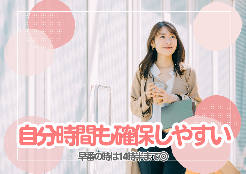 勤務時間詳細 \シフト交替制/ ①6:00~14:30 ➁10:30~19:00 *実働7.5h *残業月10時間未満 *働き方は柔軟に対応します! 「この曜日は固定で休みたい」 「来月は少し休みを増やしたい」など、 希望はお気軽にご相談ください◎ シフトは“固定”でも“変動”でも対応可能! 家事や育児など予定に合わせながら、 無理なく働ける環境をご用意しています。