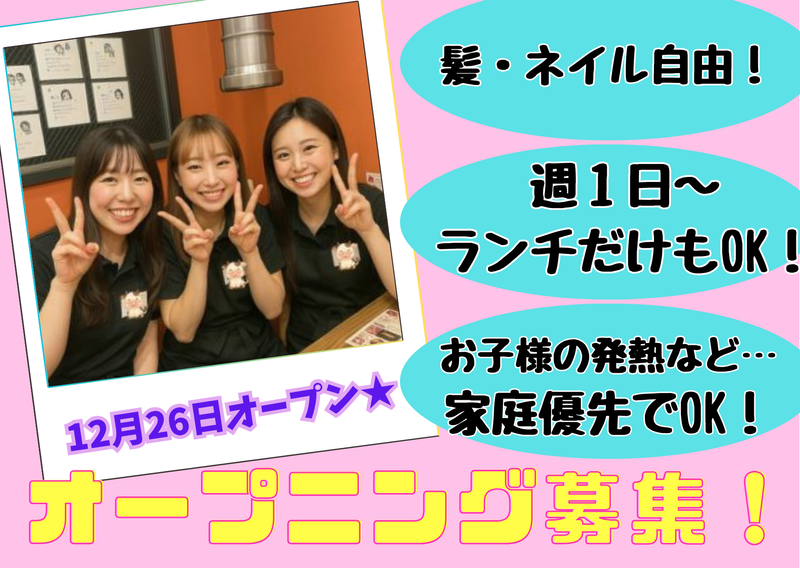 仕事内容 ✨オープニングスタッフ大募集✨ SNS総フォロワー日本一! 人気店「焼肉こじま」が 12月26日、池袋に堂々オープン♪ 「子どもが学校に行っている間だけ」 「夕飯の支度までには帰りたい」 「扶養の範囲内で賢く稼ぎたい」 そんな主婦(夫)さんの希望、全部叶います! オープニングだから、面倒な派閥や上下関係は一切なし。 全員「はじめまして」のスタートなので安心してくださいね◎ ⋱⋰ ⋱⋰ ⋱⋰ ⋱⋰ ⋱⋰ ⋱⋰ ⋱⋰ ⋱⋰ ⭐週1日・1日2h~OK!スキマ時間を活用 ⭐「平日のみ」「ランチのみ」大歓迎! ⭐急なお子様の発熱など、シフト考慮します ⭐久しぶりのお仕事(ブランク)でも安心◎ ⋱⋰ ⋱⋰ ⋱⋰ ⋱⋰ ⋱⋰ ⋱⋰ ⋱⋰ ⋱⋰ ▶仕事内容◀ 焼肉店のホール業務をお願いします。 未経験OK!まずは笑顔で「いらっしゃいませ!」から◎ オープニングだから全員が"同期"! 一緒にゆっくり覚えていきましょう♪ ~具体的には~ ✅お客様のご案内 ✅オーダー伺い ✅料理やドリンクの提供 ✅網の交換 ✅テーブルセッティング など \家庭・育児最優先でOKです✨/ 「子供が急に熱を出して…」「学校行事が…」そんな時は遠慮なく相談してください!お互い様精神で助け合うお店を目指します。「10時~14時」「11時~15時」など、家事の合間に無理なく働けるシフトでOKです。 \髪・ネイル・ピアス自由✨/「パートのためにネイルを落とす」「髪を黒く染める」…そんな手間は不要です!清潔感があれば、いつものあなたのままでOK。準備の時間も短縮して、サクッと出勤してくださいね♪