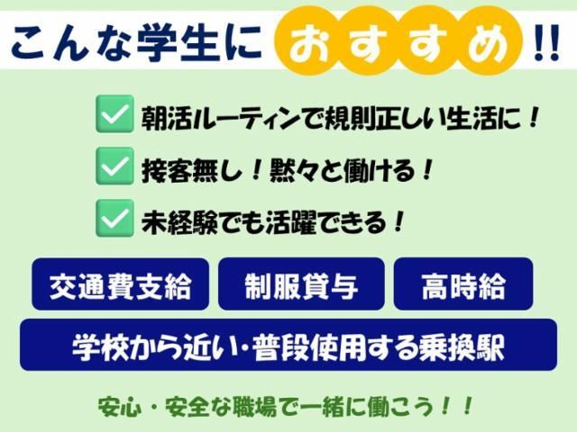 仕事情報 ● 仕事内容 【Aシフト】 ★新1年生応援シフト★ 時給:1,450円 内容:掃除機掛け、ゴミ回収、机拭き等 時間:平日週2~OK・6:00~8:30のうち2h 【Bシフト】 時給1,300円~ 内容:掃除機掛け・ゴミ回収・トイレ・給湯室・廊下・壁の清掃 時間:月~金の週5日 6:00~10:00の4時間/日 4月の出勤 時間割は4月中に決まる大学が多いので、 決定するまでの期間の出勤日は応相談下さい。 時間割が確定したら、アルバイトの曜日も固定させて働き始めましょう! 授業前に出勤! 1限は9時頃に開始する大学が多いです。 必修の授業に遅刻や欠席をしないように、授業前にアルバイトに出て、そのまま授業に行く習慣を作れば余裕ですね! ※終了時間はご相談下さい! 友人歓迎! 友達と一緒の応募も歓迎です! 初めてのアルバイトで心細い方はぜひ友達と応募下さい! 入社後にご紹介頂いた場合は、紹介報奨金の制度もございます! おすすめ こんな方におすすめです ・隙間時間に効率的にバイトしたい ・初バイトを探している方 ・誰でも簡単にできる仕事がしたい