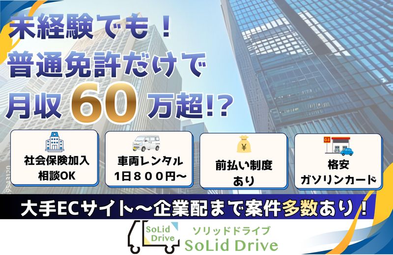 仕事内容 ◤ ̄ ̄ ̄ ̄ ̄ ̄ ̄ ̄ ̄ ̄ ̄ ̄ ̄ ̄ ̄ ̄ ̄ ̄ ̄ 普通免許でOK×無人納品でスムーズ! <面接は1回のみ><履歴書不要> ___________________◢ ✅完全固定ルート配送で覚えやすい! ✅1便完結&土日休み!基本残業なし ✅終わり次第終了で早上がりも可能◎ ✅免許があればOK!未経験も大歓迎! ✅ピッキング・荷揃えはチーム作業! 【 お仕事内容 】 都内23区のグループホーム施設へ、 業務用食材の配送をお願いします! 配送先ごとに、無人納品・裏口納品・ 留守番ボックスの鍵開けなど 丁寧な指示書があるので安心です◎ ▼お仕事のPOINT! ―――――――――― ◆1日1便&20~40件の完全固定ルート制 ◆配送距離は1日80~90km ◆時間超過・距離超過はほとんどナシ ◆9割が宅配ボックスへの納品でスムーズ ◆重量物もあるので体を動かしたい方にも◎ ▼1日の流れ ―――――― ⏩府中市のセンターへ着車(直行直帰) ⏩食材のピッキング・荷揃え(チーム制) ⏩都内23区へ配達(1日20~40件) ⏩回収物の洗浄などの軽作業 ⏩配送完了後、センターで作業終了 └ 早い方は15~16時に終業されています! 納品時間の指定はありますが、 最終16:00で遅くなることはありません◎ ━━━━━━━━━━━━━━━ ✨対面での対応はほぼナシ◎ ━━━v━━━━━━━━━━━ 9割が宅配ボックスへの納品で、 対面でのやり取りはほとんどありません。 介護施設への配送のため、 マナーや清潔感を大切にできる方なら 未経験でも大歓迎! 社会人経験が浅い方や 異業種からの転職者も活躍しています◎ ━━━━━━━━━━━━━━━ ✨SoLidDriveについて ━━━v━━━━━━━━━━━ 貨物軽自動車運送業を行う会社です。 若者が自分の仕事に誇りを持てるよう、 会社として共に成長を目指しています。 【公式HP】https://soliddrive.jp/ 実際に働くスタッフの声も多数掲載中! ━━━━━━━━━━━━━━━ ✨サポート体制もバッチリ◎ ━━━v━━━━━━━━━━━ ドライバ―・配送経験ゼロでスタート可! 普通免許(AT限定可)さえあればOK◎ ⭐車両レンタル制度あり! ⇒車がなくてもすぐに始められます ⭐ガソリン・ETCカード貸し出し ⇒経費を抑えて負担軽減 ⭐急な出費も安心! ⇒日払い・週払い制度あり(規定あり) 大手軽貨物協会のグループ加盟で、 仕事量は常に安定しています。 ━━━━━━━━━━━━━━━ ✨働き方スタイルは自由! ━━━v━━━━━━━━━━━ *髪型・髪色自由 *ひげ、ネイル、ピアスもOK *服装も基本自由 自分らしく、ストレスなく働ける環境♪ ━━━━━━━━━━━━━━━ ✨会社からのメッセージ ━━━v━━━━━━━━━━━ 皆さんには”稼ぐ”と”自分の時間の確保”の 両立を実現して欲しいと思っているので、 会社として全力でサポートいたします!!