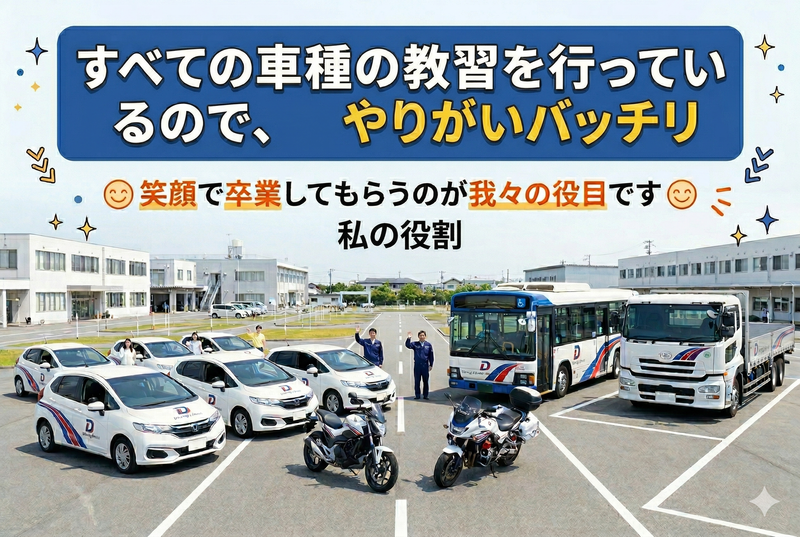 仕事内容 ═══════════════════ 🚙教習指導員(養成生)募集🚙 ~ 未経験から国家資格へ 人生を支える先生になる ~ ═══════════════════ 「何か手に職を付けたい」 国家資格を取得し 将来も安心できる専門職へ 40代、50代も多数活躍中! まだまだやれる!! 「あなたの人生経験が武器になる」 あなたの社会経験が教える力に。 ⭐資格取得後は月給24万円以上 ⭐国家資格取得を会社が支援 ⭐各種手当充実で収入UP可♪ ⭐遠方から勤務の方は社宅あり! 入社後まずは自動車教習所の 教習指導員を目指していただきます。 養成生として勤務しながら、国家資格の 教習指導員資格取得を目指します。 教習指導員資格を取得したら、 いよいよ教習指導員として 運転技術や交通安全ルールの指導を行います。 ✅具体的なお仕事内容 ・技能教習(運転実技指導) ・学科教習(交通ルール指導) ・教習生への安全運転アドバイス ・各種書類業務 ・試験対策サポート 当教習所は「総合自動車教習所」。 普通車だけでなく、 大型・中型・けん引 など 幅広い車種に対応。 資格を取得すれば、 担当できる車種が増えて給与もアップ◎ 努力が評価される環境が整っています。 ――――――――― 当教習所の特徴 ――――――――― 「資格取得=収入アップ」 取得資格に応じて 職能手当・資格手当が支給。 賞与年2回、昇給年1回あり✨ 家族手当や乗車手当など 各種手当も充実しています。 未経験から国家資格取得へ 長く安定して働ける キャリア形成が可能です。