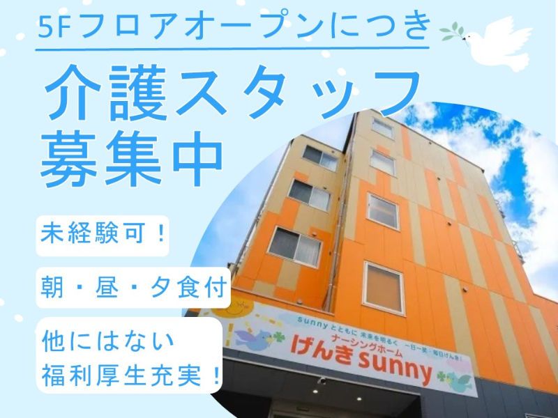 【アピールメッセージ】 【5Fフロアオープン】月給+各種手当支給あり* 住宅型ナーシングホームの介護スタッフ(正職員)募集! \介護職員(正社員)募集中/ 5Fフロアオープンにつき増員募集「住宅型ナーシングホームげんきsunny」 利用者様の身体介護や身の回りのお世話などをおまかせします。 資格を活かして活躍していただけます! 月給に加えて別途手当の支給も行っています* さらに、福利厚生も充実しており安心して働けます。 朝昼夕食付き・読書支援手当支給・趣味や推し活に使える手当の申請ができるなど、見逃せない待遇が盛り沢山です! 当社では年間休日116日体制を目指して増員募集中です! 今後もより働きやすい職場づくりを進めます* 興味のある方はお気軽にご応募ください!