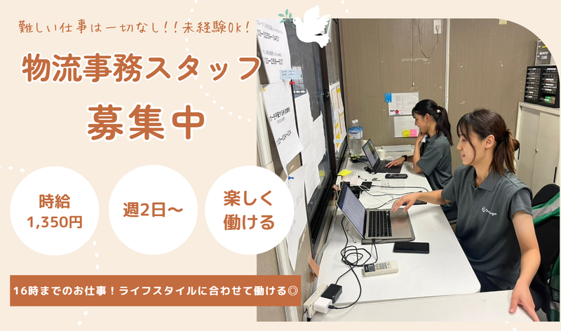 仕事内容 ▲▼▲▼▲▼▲▼▲▼▲▼▲▼▲▼▲▼▲▼ 魅力POINT 【働き方自由】 ┗週2日〜OK! 「扶養内で」「趣味と両立しながら」など、 あなたらしい働き方が見つかる! 【効率よく稼ぐ】 ┗時給1400円〜の高収入! 例えば「週2日・6時間勤務」なら、 月々6万円以上を無理なくGET! 【居心地バツグン】 ┗少人数オフィスで集中できる! 夏も冬も空調完備だから、 年間を通して快適に仕事に取り組めます。 【安心の環境で成長】 ┗未経験スタートも応援! 経験者もスキルを磨ける! 「これってどうやるの?」もすぐに聞ける! 様々な業務で着実にレベルアップ! ▲▼▲▼▲▼▲▼▲▼▲▼▲▼▲▼▲▼▲▼ \ 働きやすさをつくる仕事 / 現場運営に必要な ドライバー管理がメイン業務になります! 【 具体的な業務内容 】 ◆ルート作成 ◆問い合わせ対応 ◆シフト作成 ◆庫内清掃 ◆請求書の作成(フォーマット入力が中心) 簡単なPC操作ができればOK!! \ 両立できるちょうどいい働き方 / ⭐子育てや家事に忙しいあなたにも無理なく 働ける環境を用意しております。 扶養控除内での働き方にも柔軟に対応! 勤務時間や働き方も、 あなたのライフスタイルに合わせて ご相談に応じます。 ⭐少数精鋭のチーム(代表含む4名)で 風通しのいい職場! 未経験でも 先輩スタッフが丁寧に教えます! \ 一日の業務スケジュール /  ̄ ̄ ̄ ̄ ̄ ̄ ̄ ̄ ̄ ̄ ̄ ̄ ̄ ̄ ̄ ̄ ̄ ̄ ̄ ̄ 9:00 出社 ┗メールチェック&同日の業務確認 ↓ 9:15 問い合わせ対応 ┗ドライバーからの連絡対応 ↓ 10:00 ルート作成 ┗社内システムで配送ルートを作成 ↓ 11:30 データ入力 ┗書類準備や請求書作成 ↓ 12:30 昼休み ↓ 13:15 午後の問い合わせ対応 ┗午前同様、ドライバー対応 ↓ 14:30 ルート調整・報告書作成 ↓ 15:30 翌日の準備 ↓ 16:00 退社 \ 物流の未来を変える / OurCargo株式会社は、 配車業務の効率化を実現する物流SaaSを 開発・運営するスタートアップです。 SNSを活用した配車管理システムで、 荷主と運送会社のマッチングをスムーズに。 軽貨物配送事業では Amazon公式パートナーとしても活動中! 現場経験のある代表が立ち上げた、 ドライバーに優しい会社です。 まずは気軽にご応募ください♪