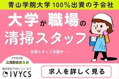 仕事内容 ここがポイント! ー◆ー◆ー◆ー◆ー◆ー◆ー◆ー◆ー◆ー◆ 女性スタッフ7割!主婦さん多数活躍中◎ 日常清掃だけのシンプル・ラクラク作業! シニア・ミドル世代多数活躍中! 青山学院100%株式出資会社で安定雇用 早朝の隙間時間を有効活用!副業も可能! 60代のシニアスタッフも多数活躍中! ー◆ー◆ー◆ー◆ー◆ー◆ー◆ー◆ー◆ー◆ 大学内の日常清掃業務をお任せします ー◆ー具体的な仕事内容ー◆ー キャンパス内の教室・廊下・階段・トイレ等の日常清掃をお任せ。 コードレス掃除機で綺麗にしたら、拭き上げ等、日常清掃。 綺麗を保つお仕事です。 無理なく働くシニア多数! 専門的な機械はナシで日常清掃のみ! 重い機械を使う作業や重労働は一切ないため無理なく働けます! 「朝早く起きちゃうから暇つぶしみたいなもんだよ」 「孫に小遣いあげるためにね。運動不足解消にもなるし」と、 シニアスタッフも多数活躍中! お仕事開始2~3日は先輩スタッフが丁寧に教えますので お気軽にご応募ください! 会社の特徴 青山学院100%株式出資会社であります。 無理のない清掃範囲で安心。現在スタッフ30名と多数在籍のため、 無理なお願いもありません。