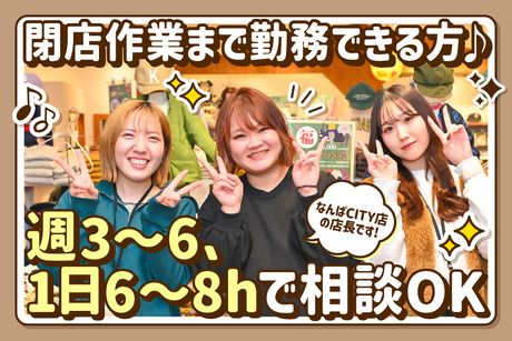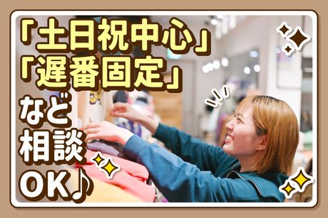 勤務時間 10:30~21:15 ★週3~6日、1日6~8時間で相談OK ★週2回以上、遅番(閉店まで)の勤務必須 ★月に数回以上、土日祝の勤務必須 - 【働き方は柔軟に対応します】 ・土日祝中心 ・レギュラー勤務 ・遅番固定で