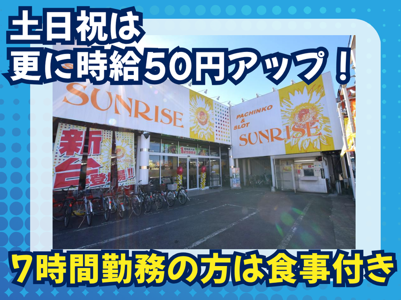 仕事内容 \\地域密着のパチンコ店の ホールスタッフ募集!// ✨早番も遅番もスタッフ積極採用中 ✨「家庭と両立したい」「安定した時間で働きたい」 そんな主婦(夫)・フリーターさんを応援します! ✨週1~!土日積極採用中◎ ✨土日祝は更に時給50円アップ! ✨7時間勤務の方は食事付き ━━━━━━━━━━━━━★☆…・☆ 地域の方に長く愛される 《サンライズホール》で、 笑顔でお客様をお迎えする シンプルなホール業務です。 重い台の移動や専門知識は不要◎ 未経験スタートの スタッフが多数活躍中です♪ 【仕事内容】 地域の皆様に愛される パチンコホールでの接客のお仕事です。 ・景品交換対応 ・メダル補充 ・空箱の提供 など、シンプルな業務からお任せします。 ━━━━━━━━━━━━━★☆…・☆ 【未経験歓迎】 先輩スタッフが丁寧に指導するので、 パチンコの知識がなくても心配ありません。 ・家事・育児と無理なく両立できる働き方 ・遅番は夜勤手当ありで収入UP ・土日祝は時給+50円UPで効率よく収入UP ・7時間勤務の方にはうれしい食事付き 「午後は家のことをしたい」 「安定した時間で長く働きたい」 そんな方にぴったりです♪ ━━━━━━━━━━━━━★☆…・☆ がんばりはしっかり評価◎ 昇給や社員登用のチャンスも! 長く働ける職場を 探している方にもおすすめです。 スタッフ同士の仲も良く、 馴染みやすい落ち着いた職場。 少しでも気になったら、 ぜひお気軽にご応募ください♪ お会いできるのを楽しみにしています!