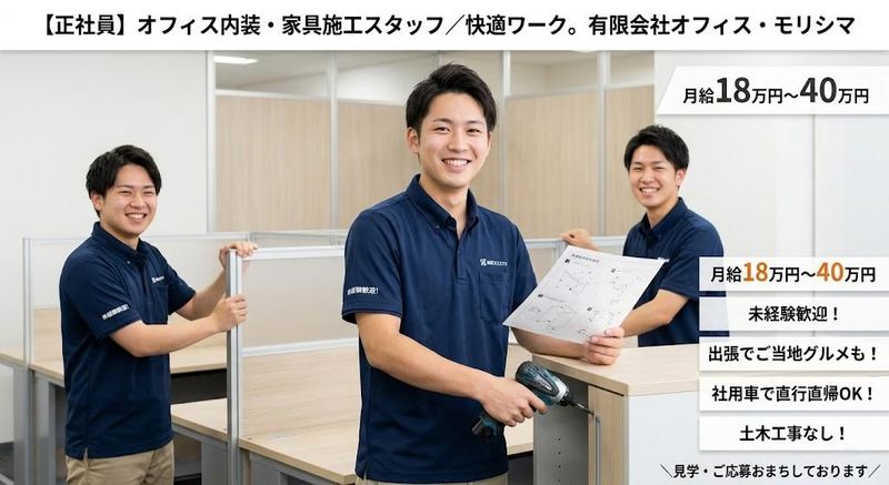 仕事内容 【ここがポイント!】 ★ オフィス専門の内装工事で、安定需要&専門性あり ★ 未経験歓迎!先輩が丁寧にサポート ★ 現場が早く終われば早上がりOK(給与は満額支給) ★ 出張あり|宿泊費全額会社負担+出張手当支給。出張先ではご当地グルメも楽しめます ★ 仕事終わりに仲間とお酒を楽しむことも多く、社用車で直行直帰も可能 【仕事内容】 企業・官公庁・金融機関などのオフィスを対象に、 家具や什器(デスク、チェア、キャビネット、受付カウンターなど)の組み立て・設置をメインに行います。 住宅工事や重機を使う土木作業はなく、オフィス空間での作業が中心なので、比較的ラフな雰囲気で取り組めます。 また、スチール・ガラス・アルミのパーティション設置や、 オフィスレイアウト変更、引越しに伴う設置補助なども担当します。 <主な業務> ・オフィス家具・什器の組み立て・設置 ・図面を見ながらの施工・微調整・仕上げ作業 ・スチール・ガラス・アルミパーティションの設置 ・資材の搬入や設置補助 ・作業後の簡単な片付け、確認作業 ※現場はチームで対応 ※施工がメインで、現場管理は補助的に行う ※出張あり(宿泊費は全額会社負担) ※社用車で直行直帰可能 【1日の流れ】 ・会社へ出社、または社用車で現場へ直行 ・現場到着、作業内容の確認 ・家具・什器・パーティションの組み立て・設置 ・昼休憩 ・午後の施工・仕上げ作業 ・作業終了後、そのまま直帰 ※現場が早く終わる日もあり、早上がりでも1日分の給与を支給 ※出張時は仕事終わりに地元の飲食店で食事を楽しむことも 【入社後の流れ】 入社後は先輩社員と同行し、簡単な作業や補助業務からスタート。 施工メインの作業で、土木工事のような大きな汚れはほとんどなく、普段着のままでもOKです。 社員同士の距離が近く、出張先ではご当地グルメやお酒を楽しむことも多い、メリハリのある居心地の良い職場です。 【会社・サービスの特徴】 オフィス・モリシマは、オフィス家具の販売・組み立てからレイアウト設計、移転、地震対策まで、 企業・官公庁・金融機関などの働く空間をトータルサポート。 経験豊富な専門スタッフが安全かつ効率的に作業を行い、快適で生産性の高いオフィス空間づくりを支援します。