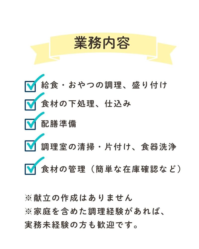 求める人材: 必須条件 特別な資格は不要です(無資格OK) 子どもたちの食事づくりに関心のある方 歓迎条件 調理経験のある方(家庭料理レベルでも可) 保育園・学校・施設などでの調理経験がある方 チームで協力して働くのが好きな方《こんな方と働きたい》 * 仲間を大切にする方 人の悪口や不平不満ばかりをいう人はお断りしています。
