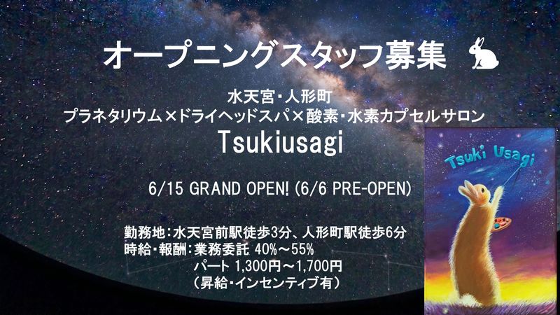 求める人材: 【技術以上に「想い」を大切にできる方を募集します】 2026年6月15日オープン。「Tsukiusagi」は、プラネタリウムの星空、酸素・水素カプセル、極上のドライヘッドスパを融合させ、お客様が日常を忘れて「現実逃避できる聖域」を目指しています。 この挑戦を共に行い、お店を一緒に育ててくれるパートナーを求めています。 ◆求めるのはこんな方 1.ホスピタリティ重視:技術以上に、お客様に寄り添う誠実さを大切にできる方。 2.共に創る熱意:オープニングメンバーとして、お店の文化作りを楽しめる方。 3.自己ケアに共感:「人を癒やすには、まず自分が癒やされるべき」という信念のもと、自らも店内の設備で輝ける方。 4.成長意欲:最新のリカバリー技術を学びたい向上心のある方。