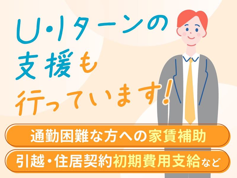 【保険制度】 雇用保険、労災保険、健康保険、厚生年金 待遇・福利厚生 【福利厚生】 ・昇給あり(年1回 10月) ・賞与あり(年2回 7月・12月) ・社会保険完備 ・退職金制度あり ・交通費(月5万円まで) ・家族手当 ・時短勤務制度あり(※子どもが満3歳まで適応可能) ・出産・育児支援制度あり ・研修支援制度あり ・U・Iターン支援制度あり(全従業員利用可) ・遠方にて自宅より通勤困難な方には、家賃の半額上限2万5000円の家賃補助 ・引越・アパート契約初期費用支給(上限20万円)