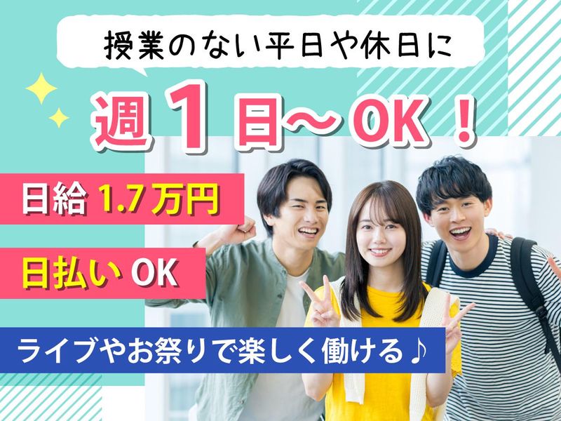 求めている人材 【応募条件】 ✅未経験OK! ✅学歴・職歴不問! ✅ピアス不可(服務規定あり) 特別なスキルや資格は一切不要! 未経験からスタートできる シンプルなお仕事です! 【こんな方におすすめ!】 ⭐すぐに収入を得たい方 ⭐未経験から始めたい方 ⭐難しくない仕事を探している方 ⭐授業やサークルと両立して働きたい方 ⭐副業やWワークをしたい方 ⭐イベントやお祭りが好きな方 学生・フリーター・主婦(夫)、 ミドル・シニアまで幅広く活躍中です。 【先輩の声】 「警備は初めてでしたが、 仕事内容がシンプルで安心でした。 先輩も優しく、すぐに慣れました!」 「イベント会場で働けるので、 毎回新鮮な気持ちで楽しいです。」 「週1日から働けるので、 授業やサークルの合間にちょうどいいです。 安定してシフトに入れるのも助かります。」 年齢の条件と理由:あり(18歳以上/例外事由2号・警備業法に基づき18歳以上の方を募集)