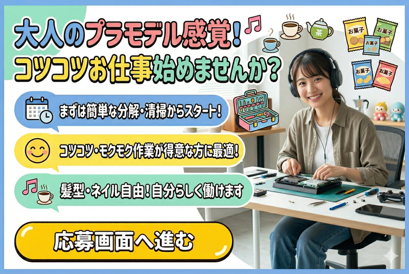 求めている人材 ■必須(MUST) ・細かな手作業に苦手意識がない方 ・一つひとつの作業を丁寧に、 正確に進められる方 ■歓迎(WANT) ・プラモデルの作成など、 モノづくりが好き・得意な方 ・電子機器の仕組みや リペアに興味がある方 「手先が器用だと言われる」 「コツコツ進める作業が好き」 そんな方にピッタリのお仕事です。 特別な経験や資格は一切不問! 現在は20代~30代のスタッフが 中心となって活躍しています。 <あれば尚歓迎の条件> ①新しいことに、 挑戦したい未経験の方 ②長期で安定して働きたい方