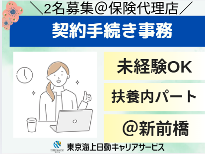 仕事の内容 \2名募集!週3時短パート/ ◆金融機関のご経験あればOK ◆扶養内@時給1370円 ◆勤務時間や曜日の相談OK! 【基本情報】 雇用形態:派遣社員 雇用期間:長期(3カ月以上) └開始日相談可能 ※即日勤務歓迎 就業時間:10:00~15:00(休憩60分) └勤務時間の相談OK/フルタイムで働きたい方も歓迎です! 【必須条件】 ◆金融事務のご経験ある方(保険会社・代理店・金融のいずれか) ◆パソコン:基本操作(入力~修正) 【お仕事内容】 ・契約に関する見積書、申込書の作成 ・更新、内容変更、解約手続き ・申込書のチェック ・発送 ・電話取次 など 【環境面等】 前橋市内にある保険代理店 @新前橋駅から徒歩15分*車通勤OK(会社駐車場あり) └周辺に、スーパーやドラッグストアなどがある便利なエリア ・30代・40代・50代の多い職場 └男女比2:1 └わからないことは質問、確認をしながらオシゴトできる環境です ・穏やかで落ち着いた雰囲気 ・お弁当持参OKです/コンビニ ・オフィスカジュアル内で服装自由/ 【福利厚生等】 ・扶養内OK ・禁煙オフィス!煙苦手な方も安心 ・平日のみOK!土日祝休み ・年間休日120日以上&お休み相談可 └有給休暇 ○●ご応募検討中の方へ●○ 地元でムリなくご勤務したい方にオススメのオシゴトです! 景気の影響を受けにくい、ホケン事務をまずはパート勤務で始めてみませんか? 少しでも気になった方は、ぜひお気軽にご応募ください♪ ○●嬉しいPOINTたくさん!●○ 履歴書不要!即日勤務OK・開始日相談も受付中!/長期×扶養内パート/ブランク・ホケン未経験OK/社員に相談できる/資格取得支援/勤務時間・曜日相談OK*実働4時間以内勤務